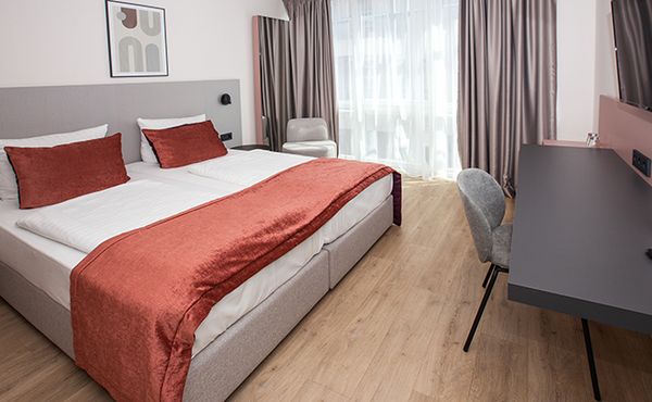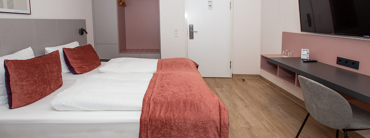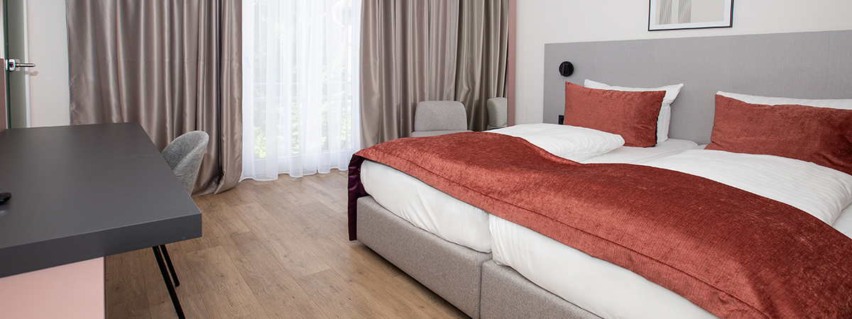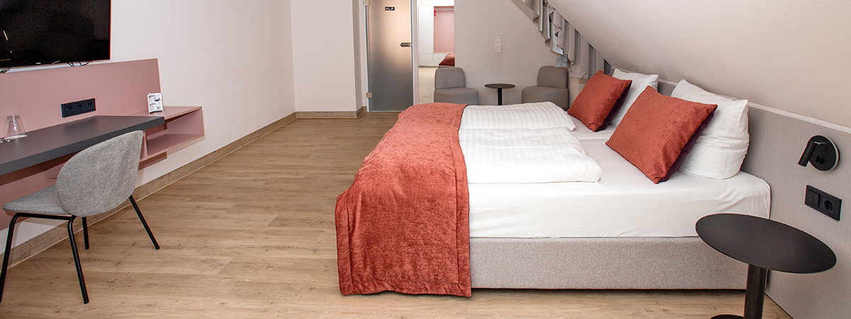 Übernachten Sie in einem unserer komfortablen Zimmer. Fühlen Sie sich wohl in entspannter Zimmeratmosphäre aus warmen hellen Farben und kontrastreichen Holztönen.