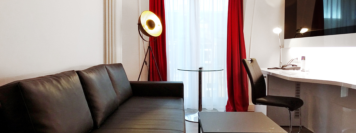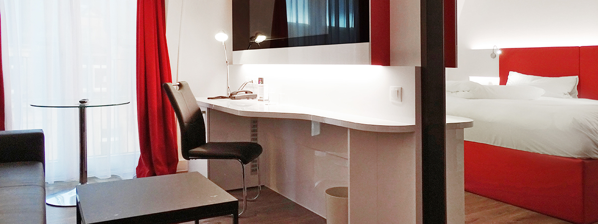 The individually cut DORMERO Suites have a size of 32 – 49 sqm. They provide sufficient free space for any occasion that may bring you to Dresden, even for a longer stay. The suites will convince you thanks to their bright red leather couch combination and their calm location towards the side street. There are separate spaces for living and sleeping, thus enabling you to accommodate the odd visitors after an exciting night of partying for a good night’s sleep.