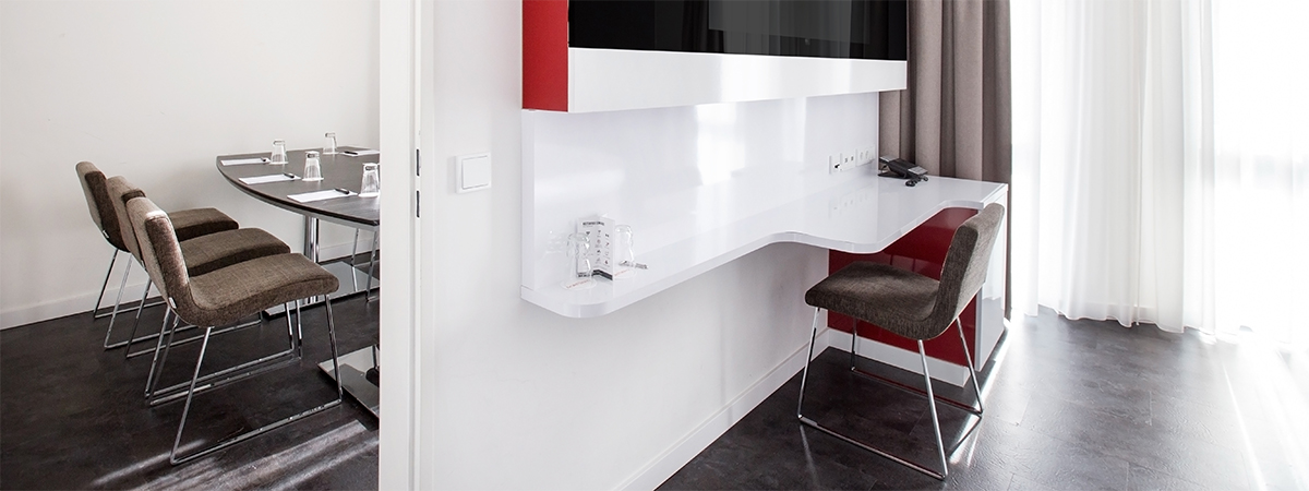 The Business Suite is the ideal place to feel at home, relax and recharge your batteries. Two separate areas on 32 sqm with a view of Frankfurt provide comfort particular for those who stay for a longer time. With the free entertainment program and the free minibar you may chill out at the end of any day however long at the DORMERO Hotel Frankfurt Messe.