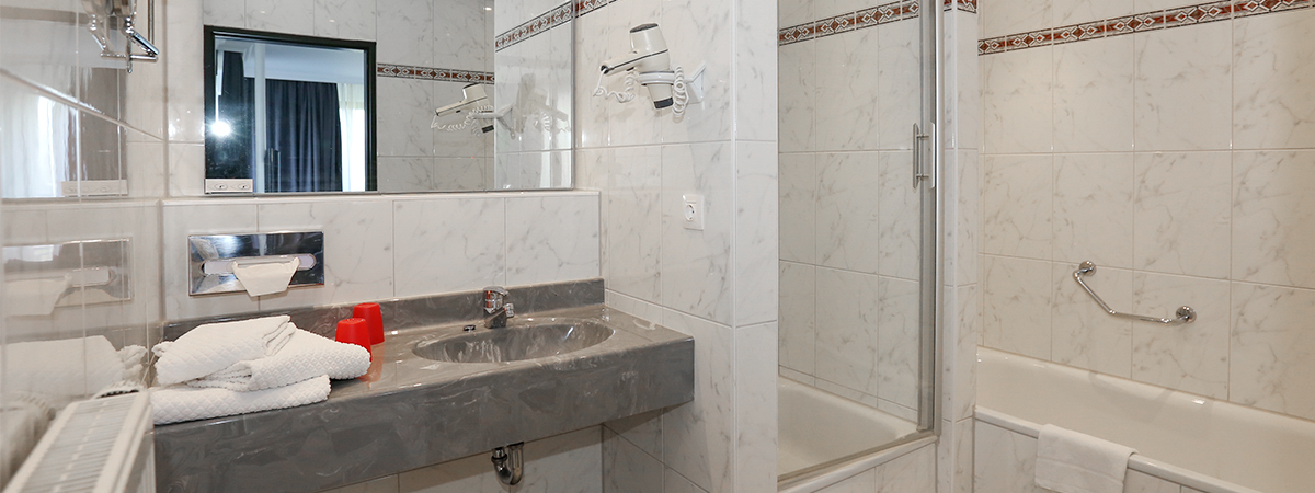 - bathroom with shower or bathtub, hairdryer and cosmetic mirror
