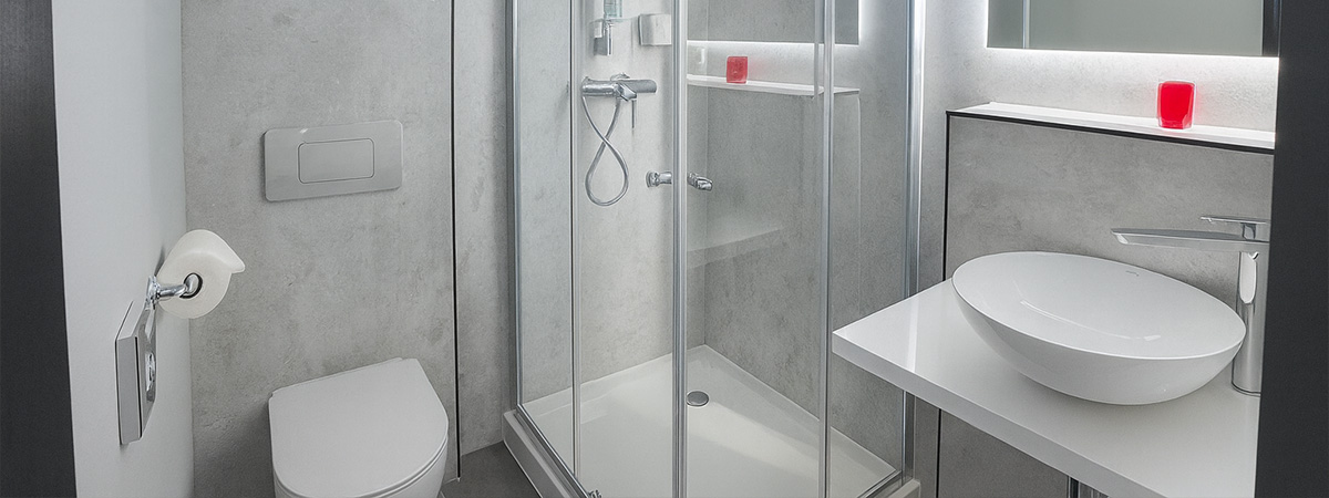 - bathroom with shower, hairdryer and cosmetic mirror