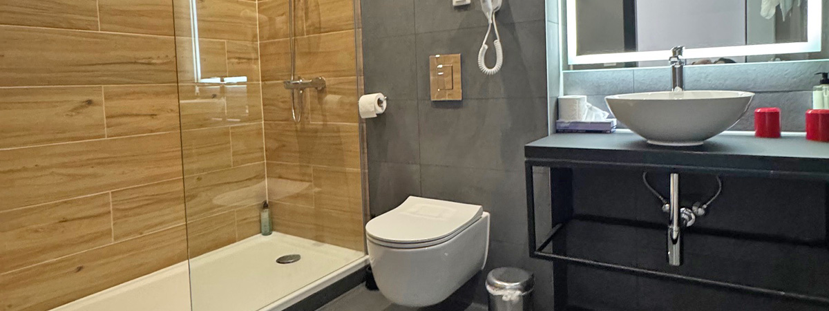 - bathroom with walk-in shower, hairdryer and cosmetic mirror
