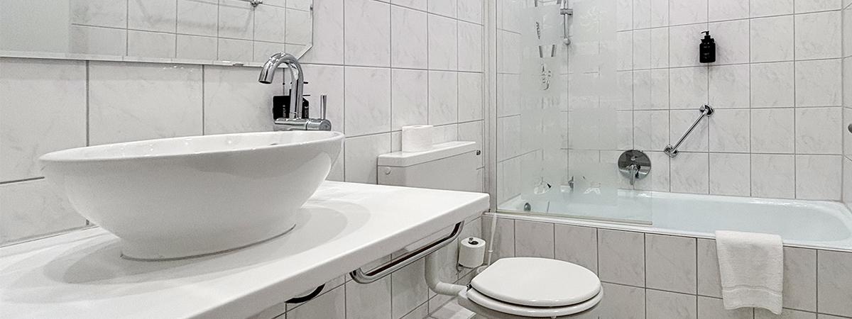 - bathroom with shower or bathtub, hairdryer and cosmetic mirror