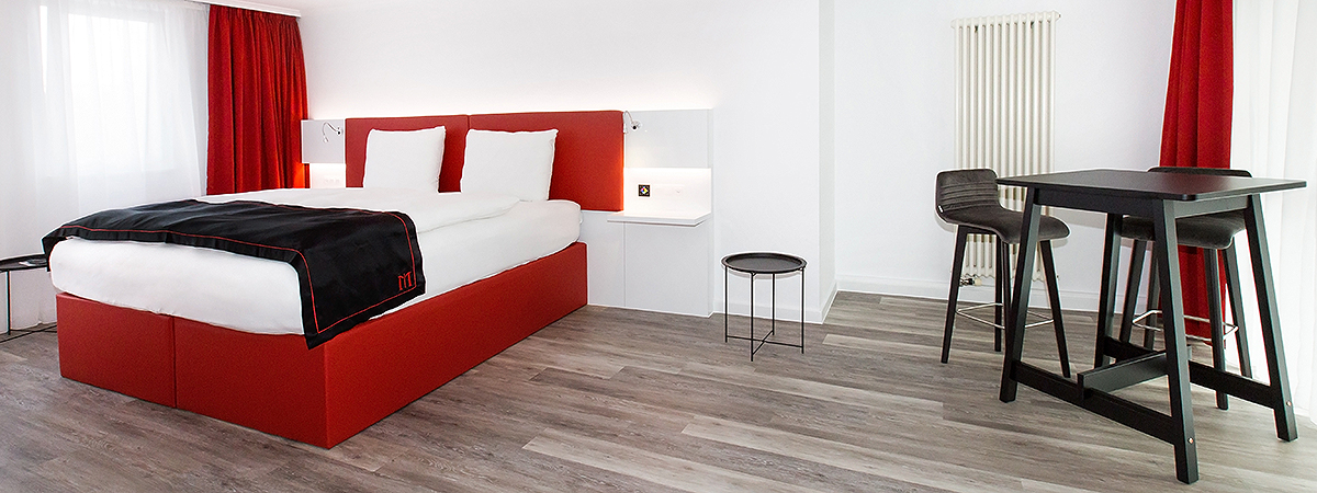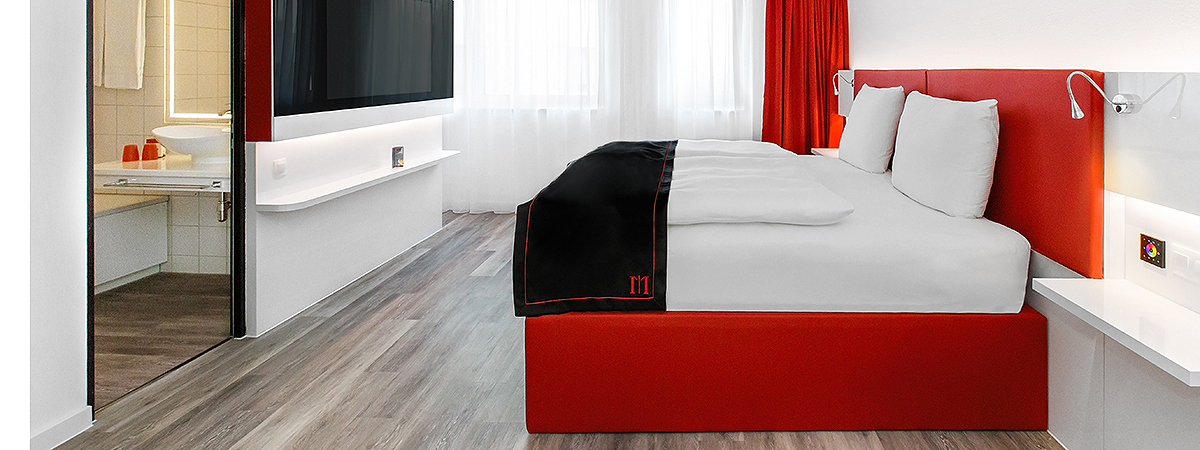 For longer or special stays, the DORMERO Junior Suites of 70 sqm provide just the right backdrop. A clear design, black and red accent colors, much light, a parquet floor as a well as a separate living and sleeping area are the features of this room category. Relaxing dreams are guaranteed by the DORMERO sleeping system kingsize bed.