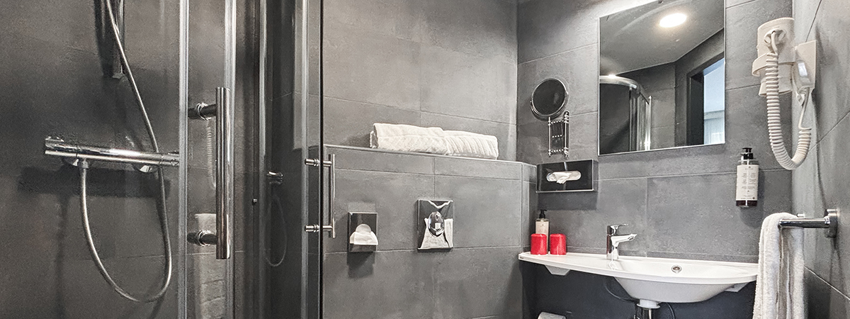 - bathroom with shower, hairdryer