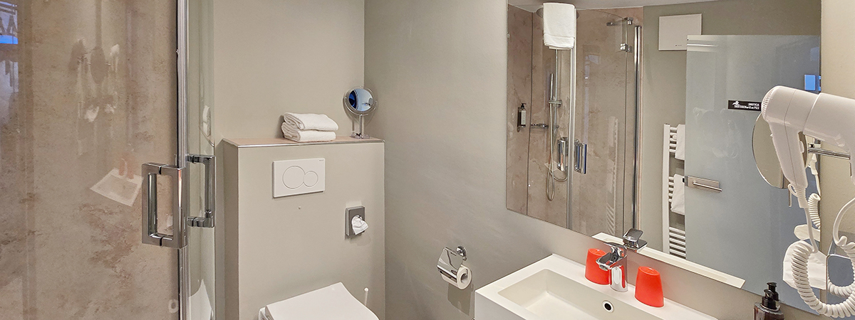 - Bad mit Dusche oder Badewanne , Fön und Kosmetikspiegel
