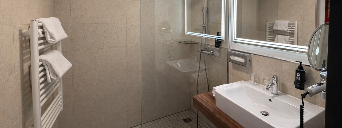 - Bad mit Dusche, Haartrockner und beleuchtetem Kosmetikspiegel