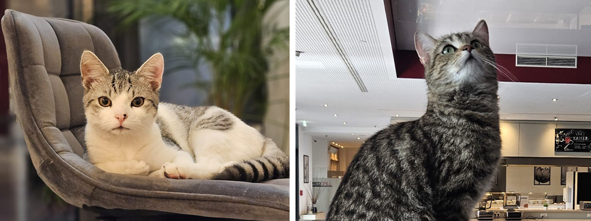 Wenn du das nächste Mal im DORMERO Hotel Hannover ein gemütliches Kätzchen siehst, das mit dem Schwanz auf den Boden trommelt und entspannt an der Rezeption liegt, ist das Nala. Und wenn dir draußen im Garten oder im Wellnessbereich ein neugieriger Kater begegnet, dann hast du Anton kennengelernt – die beiden unangefochtenen Herrscher des Hotels.