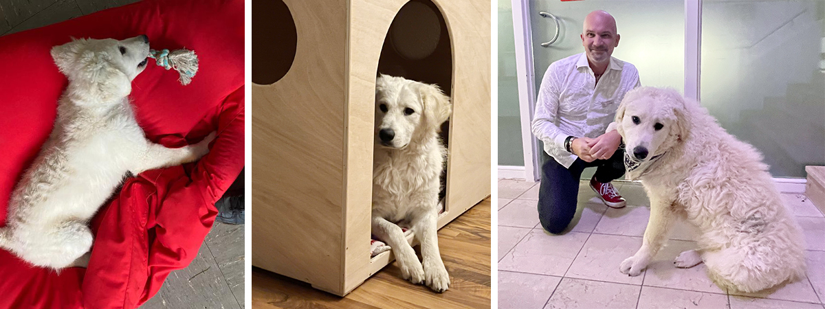 ich bin Vodka, ein junger, flauschiger Kuvasz. Ich bin ein ungarischer Herdenschutzhund, also können sich die Gäste immer sicher fühlen, wenn ich in der Nähe bin. Aufpassen liegt mir quasi im Blut.